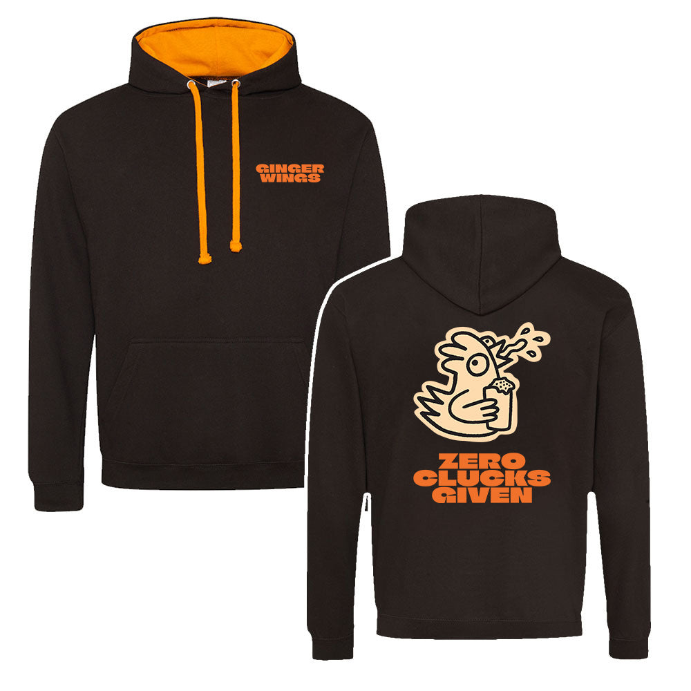 Printed with Ginger Wings logo on the breast and Zero Clucks Given design on the back.